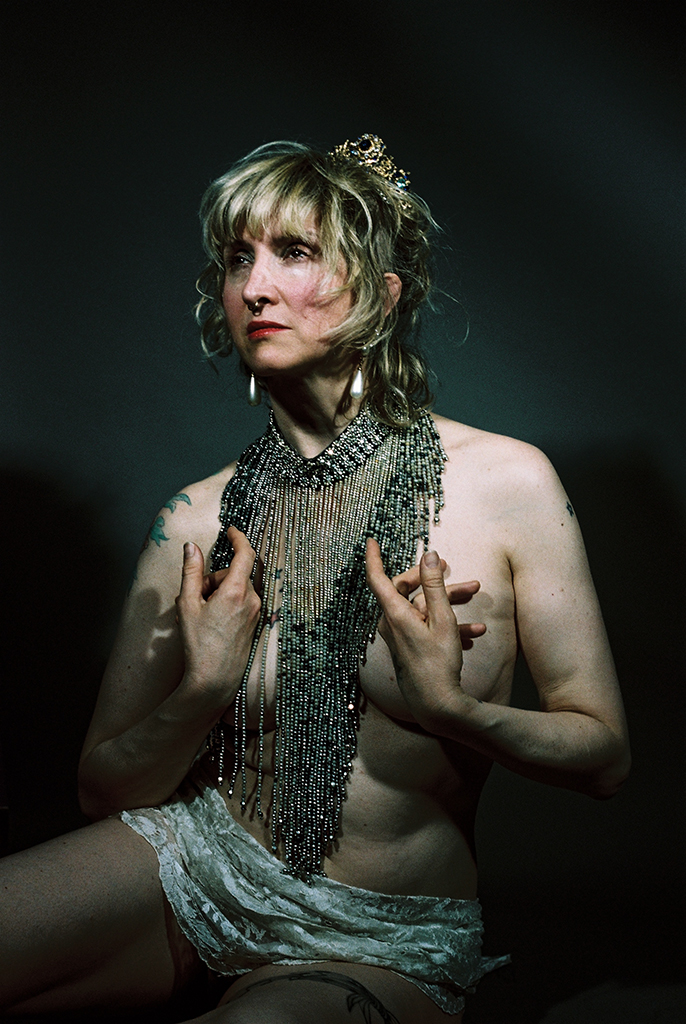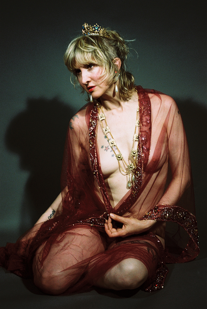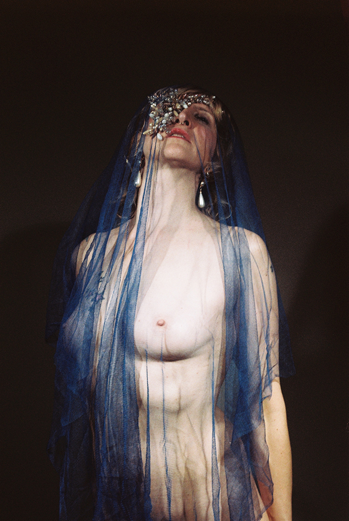 Entre Odalisque et Sylphide, ou déesse, la voilée/dévoilée se pare et se dénude, ornée de bijoux telle une effigie de l’Art nouveau. Désirante, désirable et immaculée.